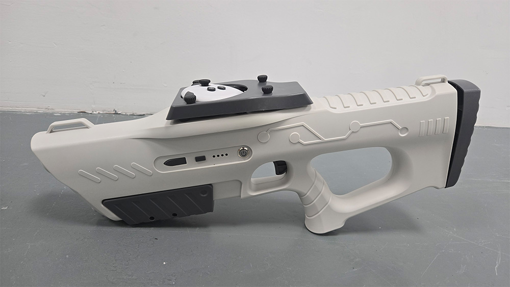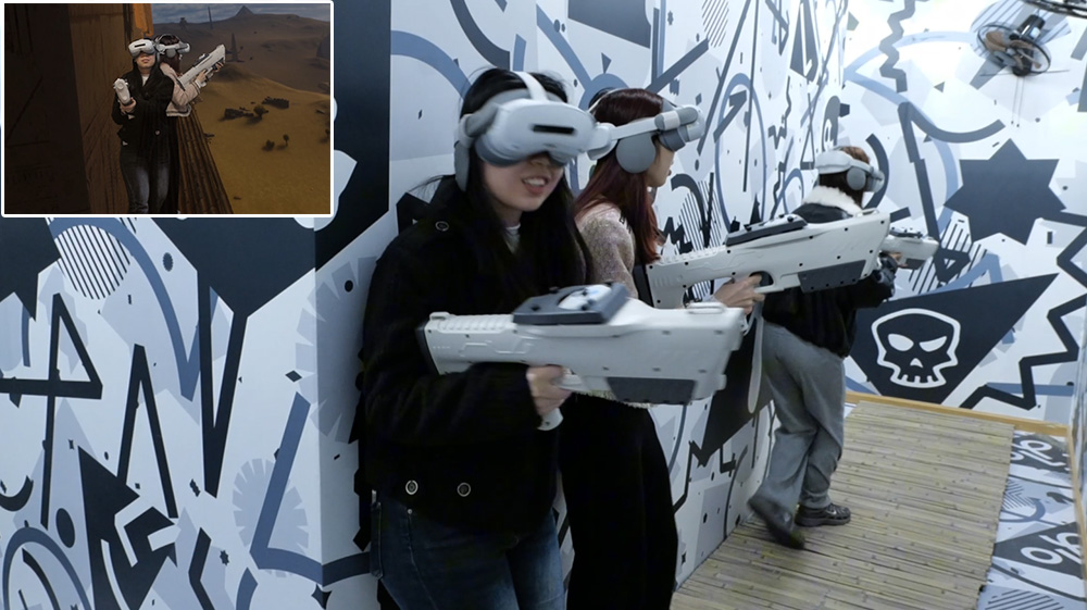 4、用戶無需背負(fù)沉重設(shè)備,僅需佩戴輕量化頭顯與動(dòng)捕手柄 (科幻槍模),即可在虛實(shí)融合的開放場景中自由行走互動(dòng)