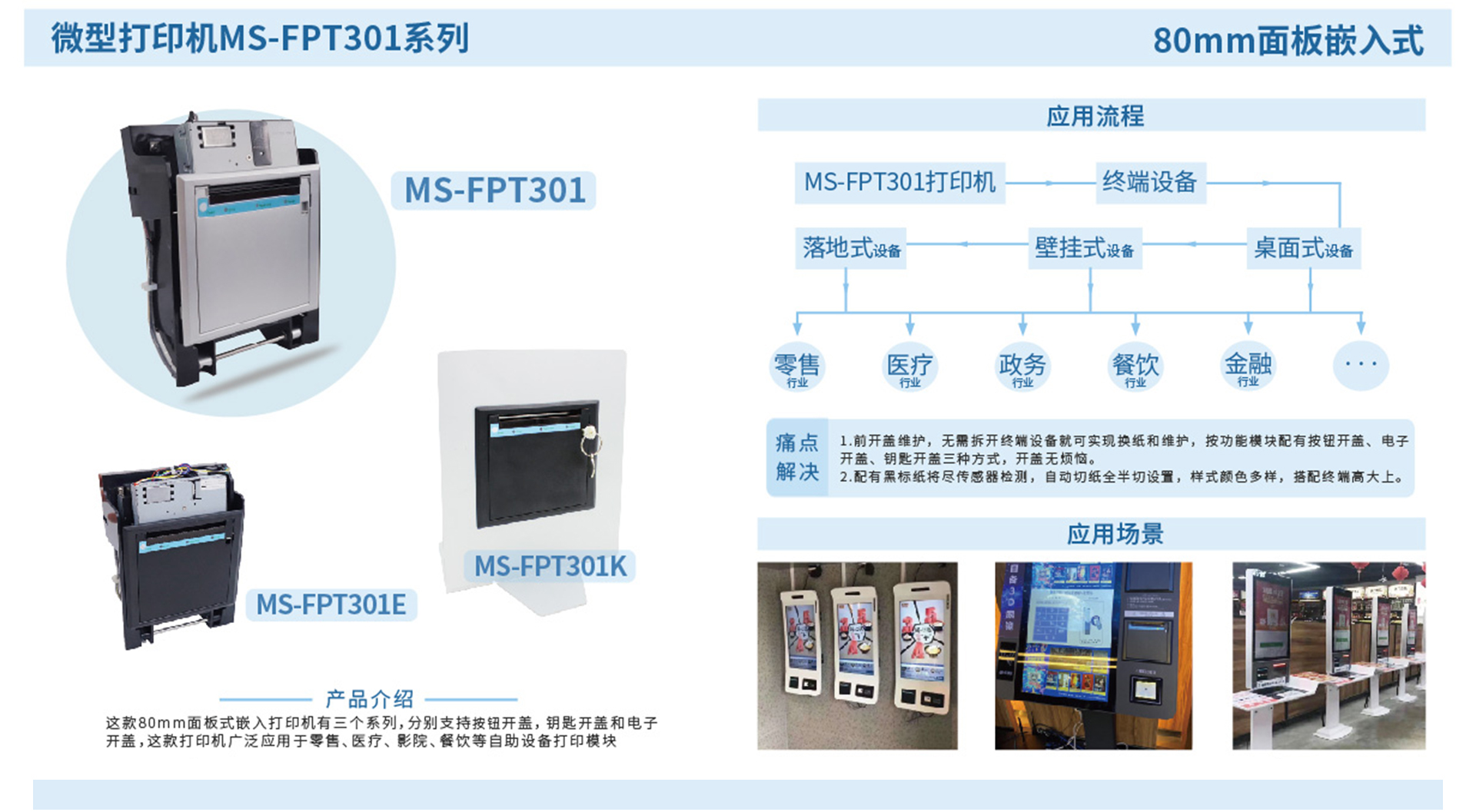 美松微型打印機有58mm微型打印機,業內也稱58面板式打印機;80mm微型打印機,業內稱80面板打印機。微型打印機圖片、解決方案、應用場景案例圖示: