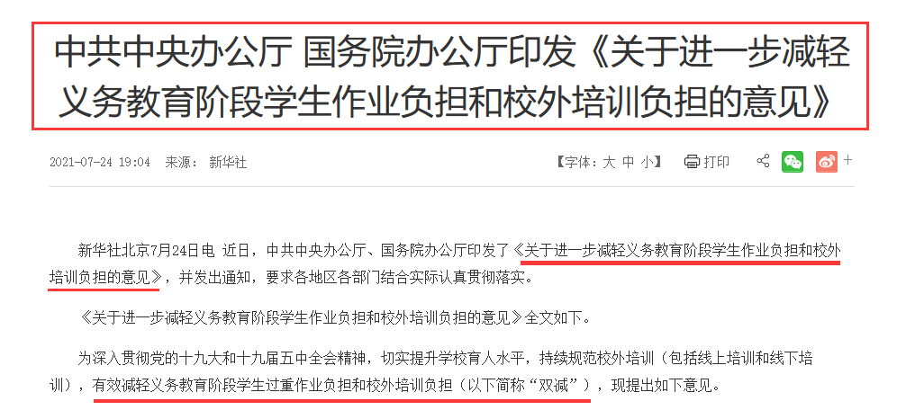 教育是百年大計(jì),為管理校外培訓(xùn)不斷標(biāo)準(zhǔn)規(guī)范化,近期,中共中央辦公廳、國(guó)務(wù)院下發(fā)了有關(guān)于進(jìn)一步減少九年義務(wù)基礎(chǔ)教育階段的《意見(jiàn)》和“雙減”(如下圖),引起社會(huì)的諸多觀注。