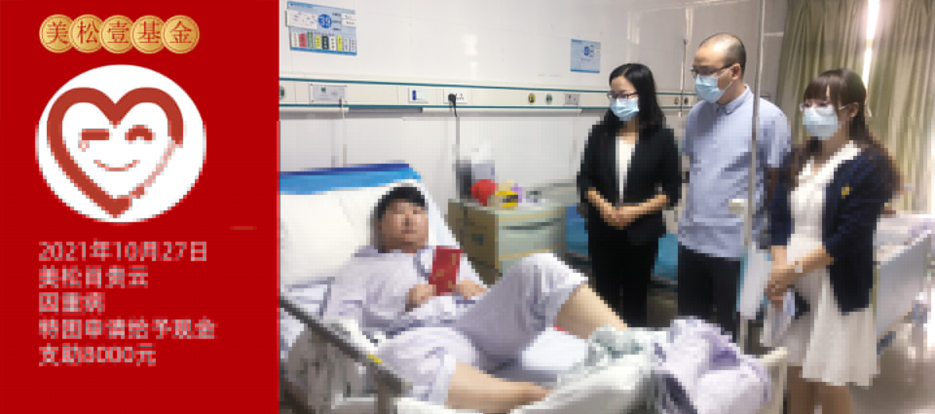 2021年10月27日,美松壹基金委員朱素芳、行政部肖華、廠務副總戴輝,一同前往光明醫院慰問生病員工資材部同事肖貴云,為肖貴云及其家人送去8000元愛心款項支助,并表達了親切的問候,在詳細了解了其病情及治療情況后,囑咐他安心休養,爭取早日康復!
