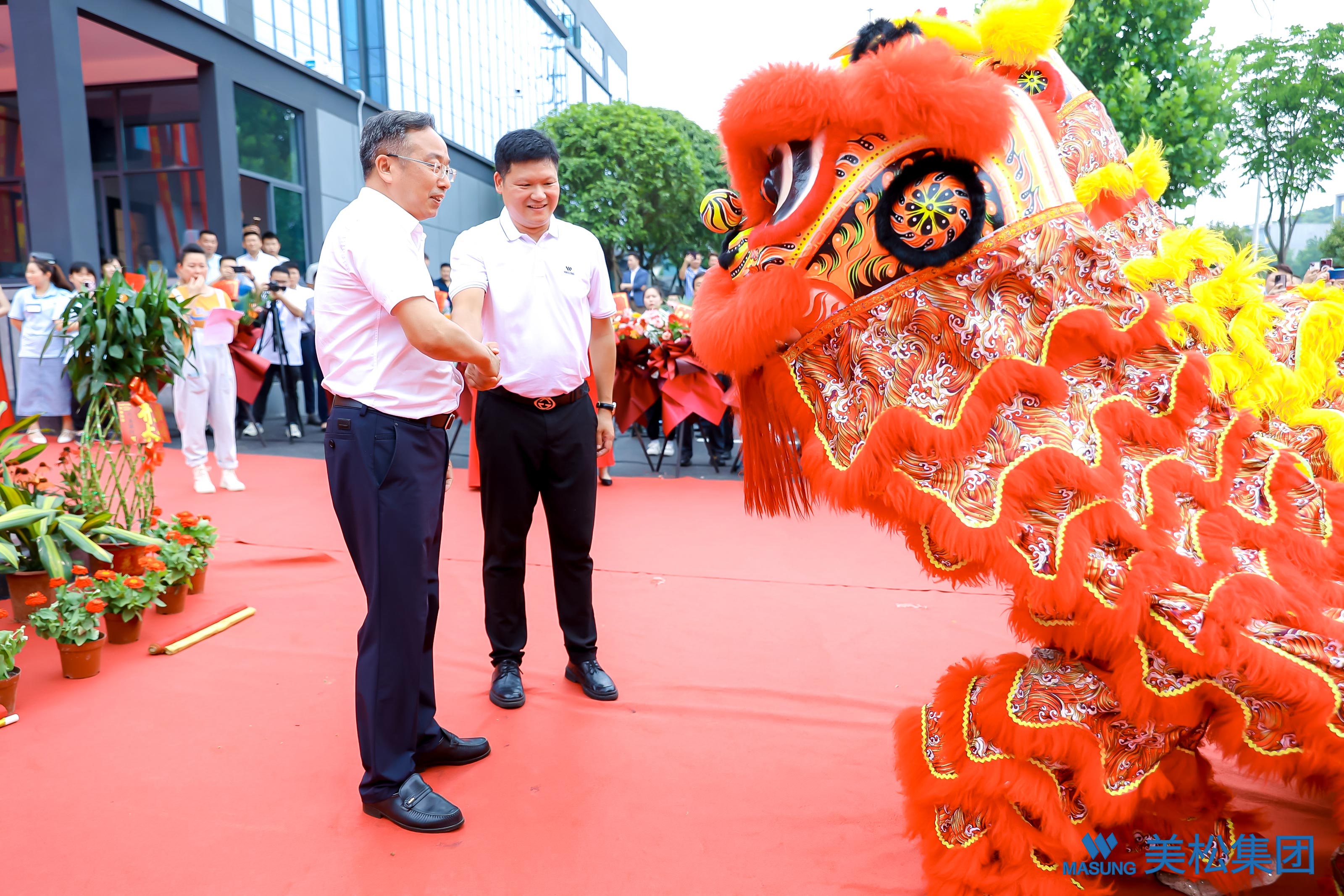 美松集團董事長陳斌先生和望城經開區黨工委姚羅光同志共同為美松集團智能產業園園碑揭幕,同時也為沉睡的祥獅點上尊貴的一筆,把朱砂涂在獅的眼睛上,象征賜予生命,寓意虎虎生威,事業興盛,祥瑞如意,宏圖大展。一點左眼靈氣滿身,二點右眼志在乾坤,三點額頭旭日凌空,照亮生財之道,四點獅嘴招財,納祥無限,財源滾滾自天來。