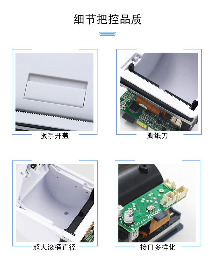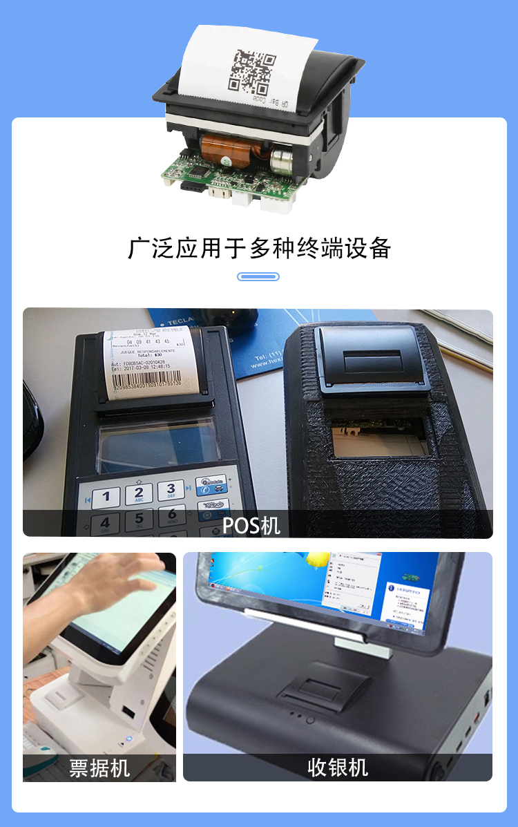 微型打印機特點:前開蓋維護,無需拆開終端設備就可實現換紙和維護,8V~12V低電壓供電58mm打印機,嵌入體積小巧