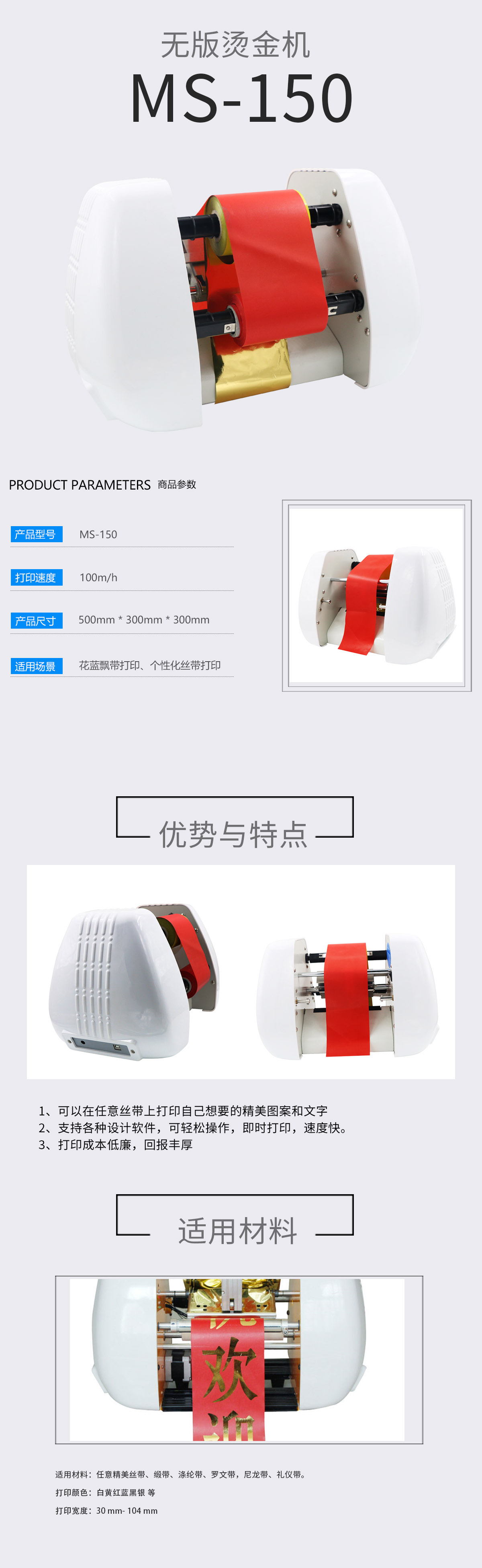 美松全自動絲印機 1.體積小(桌面擺設) 2.速度快(是普通打印機的5倍) 3.打印成本超低,每條僅需3毛線 4.任意在絲帶上打印精美的圖案,文字,標志 5.超寬的打印幅度,可滿足不同客戶的需求 6.采用進口高精度,防靜電,防劃傷打印頭,經久耐用 7.邊排版邊打印,現打現用,方便快捷 8.支持各種軟件設計,可輕松操作即時打印