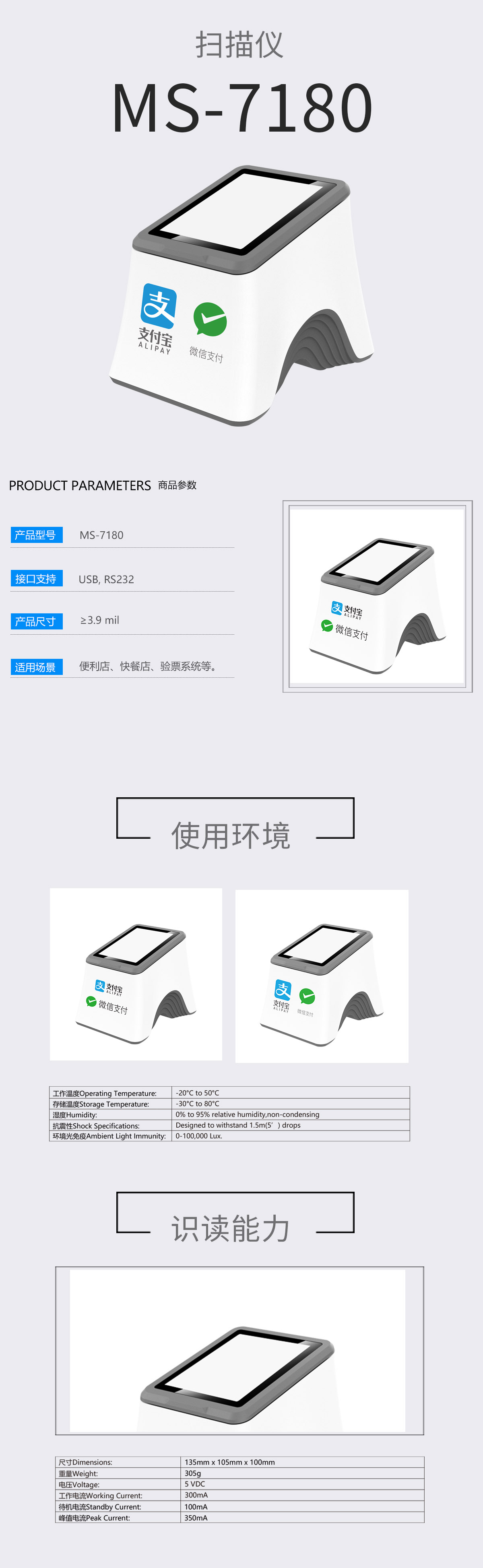 美松二維碼掃描模塊MS-7180掃描二維碼收款,條碼掃描收款,大窗口模式,支持貼屏掃碼,無需對(duì)準(zhǔn);支持微信,支付寶,美團(tuán)等掃碼支付;掃碼成功語音播報(bào) ,解放收銀員,更避免漏單;接口豐富,內(nèi)置RS232 和USB接口;經(jīng)典外觀設(shè)計(jì),視場40.5°(H)x31°(V),運(yùn)動(dòng)容差>2m/s,接口支持USB, RS232,掃碼槍二維碼支付盒子,掃描平臺(tái),超市收銀,醫(yī)院藥店電子醫(yī)保卡,社保卡,健康碼掃描器掃碼墩小白盒,手機(jī)支付/電子醫(yī)保卡/健康碼.
