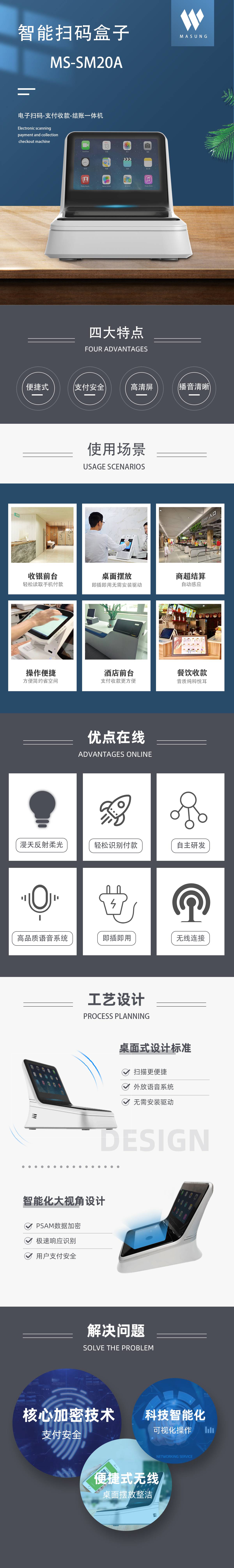 美松二維碼支付收款機(jī)MS-SM20A智能盒子采用掃一掃,二維碼,雙聲道立體音喇叭外放,商家只需用戶提供收款碼就可實(shí)現(xiàn)快速收款的收款機(jī),二維碼掃描,對(duì)商家收款帶來便利,對(duì)用戶二維碼支付提供安全,交易實(shí)現(xiàn)快速精準(zhǔn)安全模式.電子掃碼,支付收款,結(jié)賬一體的設(shè)備,支持微信,支付寶,公交碼支付,掃碼成功語(yǔ)音播報(bào) ,解放收銀員,更避免漏單,接口:網(wǎng)口,4G和USB,經(jīng)典外觀設(shè)計(jì)。