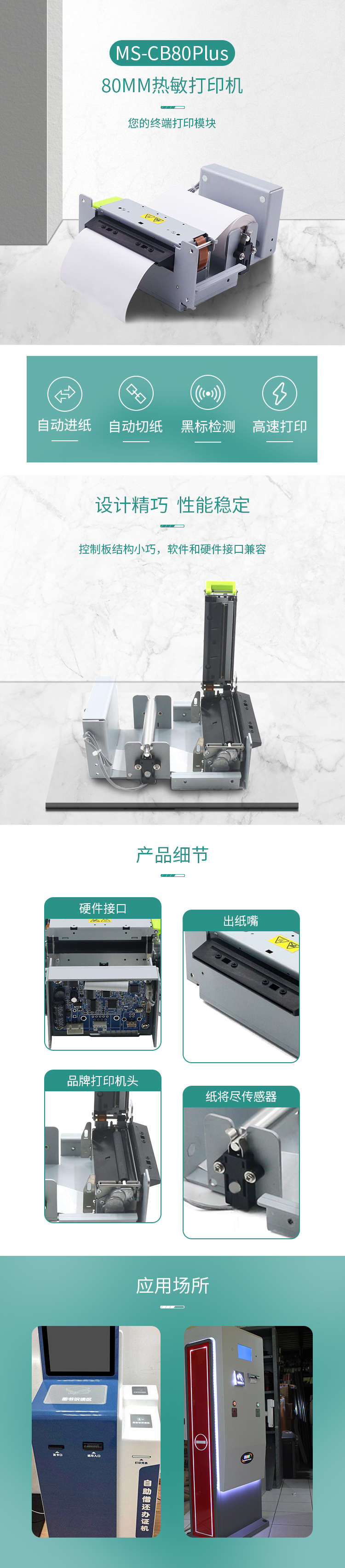 美松(MASUNG)80mm嵌入式熱敏打印機MS-CB80Plus 1.配置超低出紙口 2.側翻蓋維護 3.適用于矮小空間嵌入的打印機 4.擁有自動切紙、紙將盡、黑標檢測等功能,軟件和硬件接口兼容