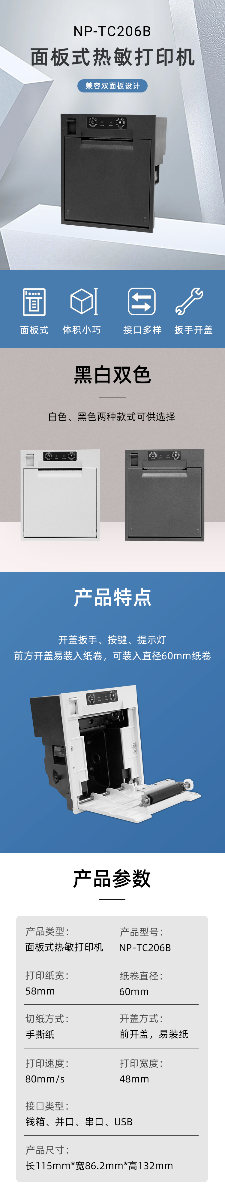 1.面框可以兼容80mm打印機安裝尺寸 2.擁有易裝紙、手撕切紙等功能 3.設計精巧,操作簡易等特點 4.開蓋扳手加軸強度高、黑標傳感器(可選)等優良特性 5.零售、餐飲、娛樂、醫療、物流等行業的自助終端設備理想打印伙伴
