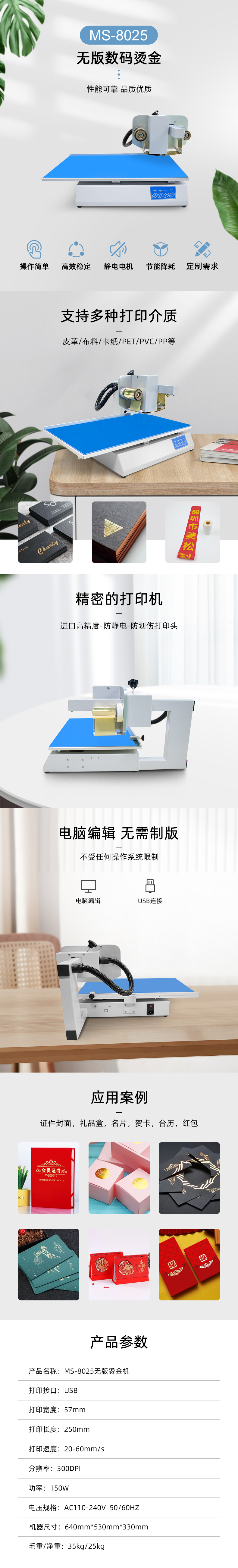 美松無版數(shù)碼燙金機(jī)MS-8025采用日本原裝rohm打印頭,最新設(shè)計(jì)徹底取代傳統(tǒng)的燙金機(jī)。身材小巧、節(jié)約空間重量、方便移動(dòng);最大打印厚度可達(dá)30mm、用途廣泛。軟件控制、可加工復(fù)雜圖案文字照片等,可在不光滑的卡紙、皮革上燙印各種圖案文字。用戶無需制版、開模,功率低,經(jīng)濟(jì)快捷,簡單操作,一看即懂,輕松自如。