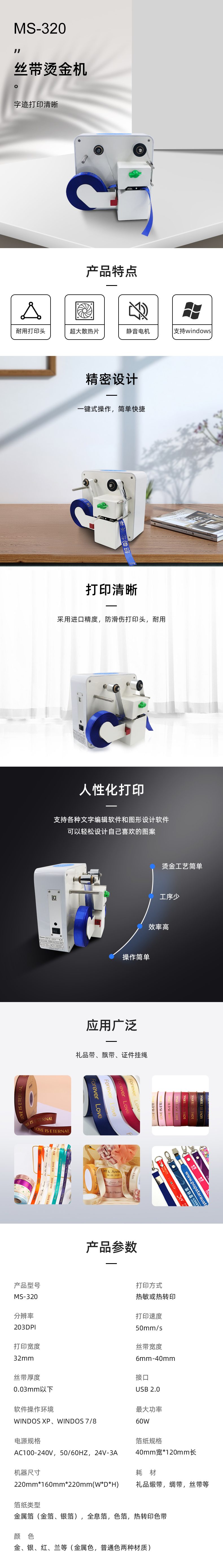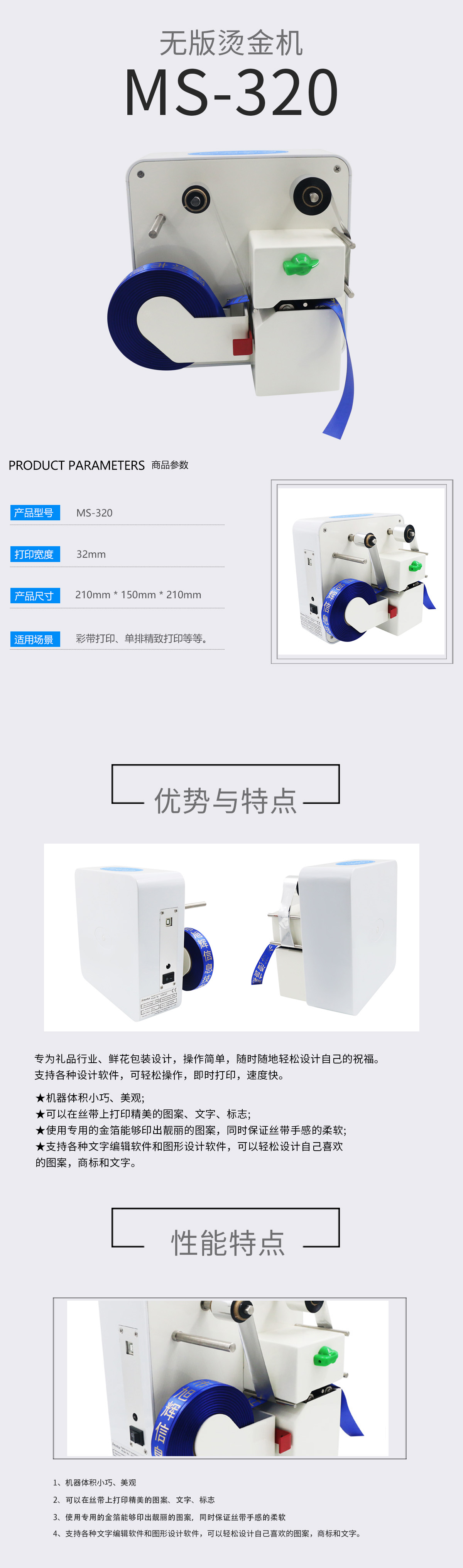 美松全自動絲印機 1.機器體積小巧,美觀(桌面擺設) 2.速度快(是普通打印機的5倍) 3.在絲帶上打印精美的圖案,文字,標志 4.使用專用的金箔能夠印出靚麗的圖案,同時保證絲帶手感的柔軟 5.支持各種文字編輯軟件和圖形設計軟件,自定義打印商標和文字