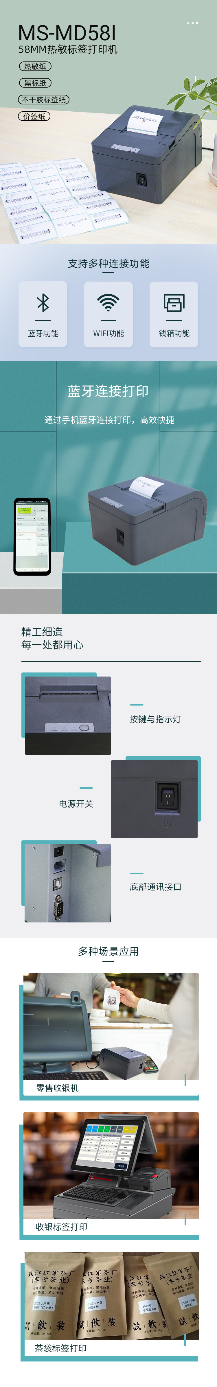 美松MASUNG自主研發58mm熱敏小票打印機 1、通信接口多樣化選擇(錢箱、串口、USB、藍牙) 2、外觀多元化(顏色多彩選擇) 3、具有黑標和探縫傳感器功能檢測,適用多種打印紙(普通熱敏紙、黑標熱敏紙、帶間隙不干膠熱敏紙) 4、上紙簡易化