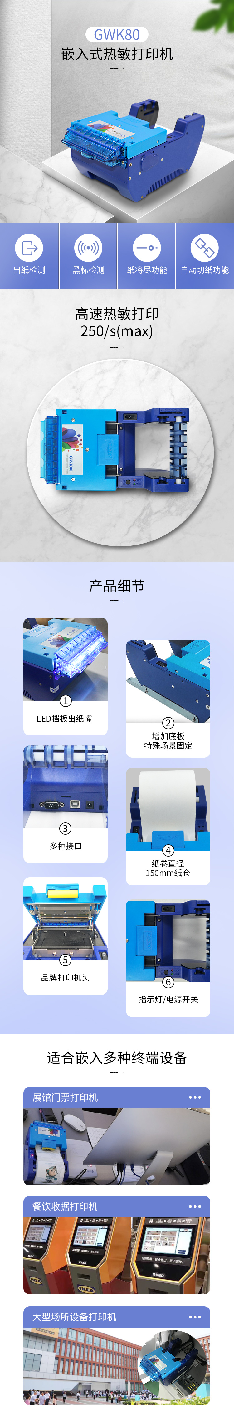 GWK80自助零售餐飲收銀小票機,票據單據收據專用打印機 送貨單銷貨單打印,80mm熱敏打印機,可打印80毫米或82.5毫米的紙寬,入紙口與出紙口水平出紙,為走紙提供類似機場跑到的場地,極大限度保證走紙順暢,避免打印卡紙,降低打印故障,防堵防拽LED擋板出紙嘴,隨時檢測走紙情況,黑標檢測功能,檢測黑標位置并實現打印,適用于電影院和彩票等行業.GWK80適用于打印量大、打印內容特殊化、票據格式多樣化等行業的應用,應用場景多見于醫院、銀行、政務、交通等人流量較多的行業。