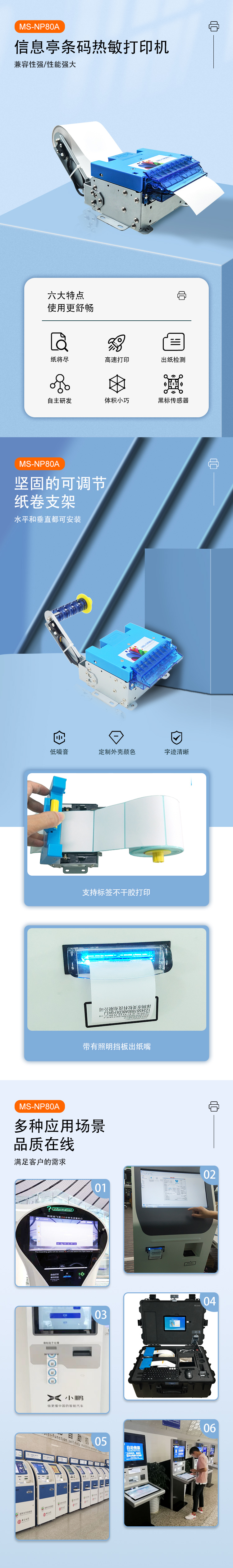隨著疫情的影響,無人自助式終端設備的需求也在逐漸變大,無人自助式終端設備往往由多個小型設備構成,其中就需要微型的嵌入式打印機,為了實現(xiàn)自助終端設備的穩(wěn)定性,需要打印機具有良好的性能,MS-NP80A具有體型小巧,高集成度等特點可方便嵌入各種自助設備。