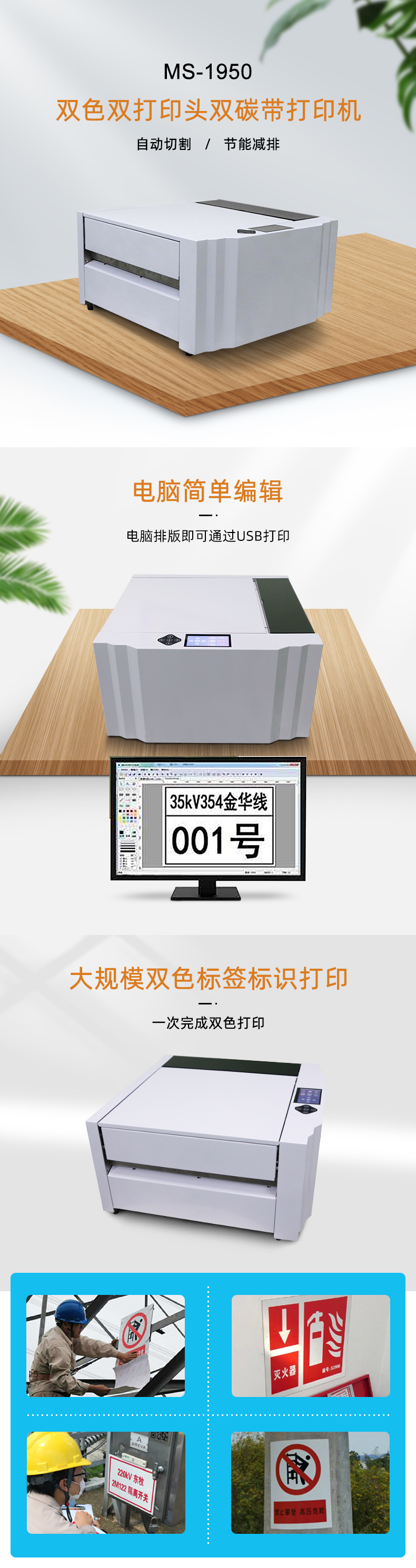美松MASUNG自主研發(fā)熱轉(zhuǎn)印雙色標(biāo)識(shí)牌打印機(jī) 1.打印大幅面標(biāo)示牌,且自動(dòng)切割 2.無需制版,電腦排版完通過USB打印,方便快捷 3.碳帶熱轉(zhuǎn)印方式打印,文字清晰耐刮永不褪色 4.支持PVC+貼合鋁箔復(fù)合材料、PVC標(biāo)識(shí)貼紙材料等打印 5.熱轉(zhuǎn)印打印防水防曬耐腐蝕,經(jīng)久耐用