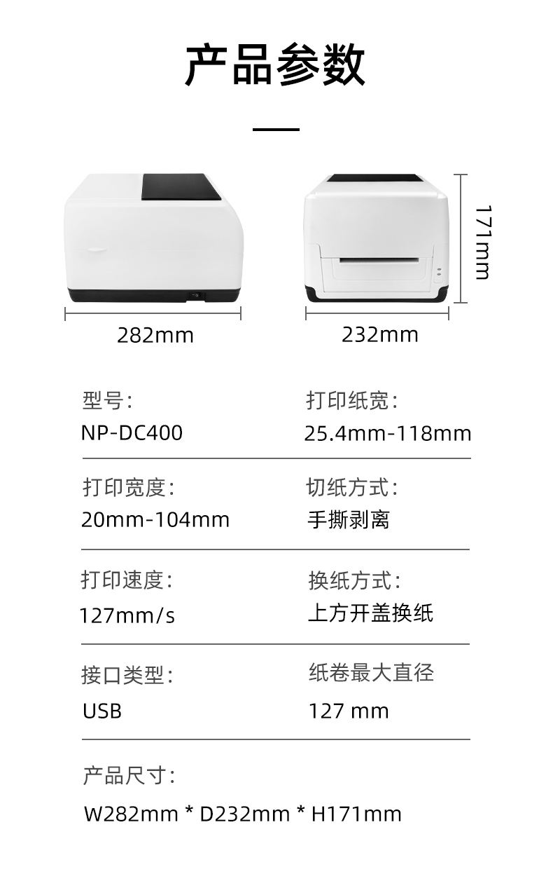 NP-DC400是一款由美松研發的熱敏/熱轉印標簽標識打印機,具有體型小巧。外觀時尚,擺放方便,打印效果強力的特點。