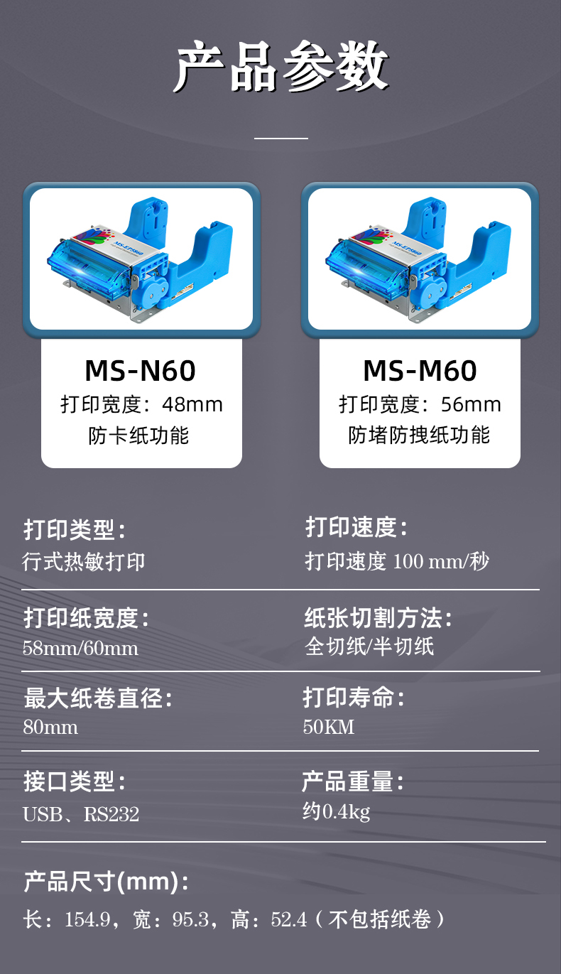 MS-N60/M60是美松全新研發的一款新的熱敏票據打印機,完全取代MS-D245熱敏票據打印機,可打印熱敏不干膠標簽。MS-N60/M60對工作電壓進行了全新的升級,現在的工作電壓在12V±5%V,使自助機的整體運行更方便,具有高亮LED燈光出紙嘴,可對打印頭溫度、缺紙、黑標、紙將盡、防堵、防拽等熱門功能需要進行配置,MS-N60/M60可應用于自助快遞柜、商超存包柜、自助排隊機、自助取票機等多種自助票據設備 MS-N60打印的尺寸為48mm;MS-M60打印的尺寸為56mm,帶防堵防拽紙功能。