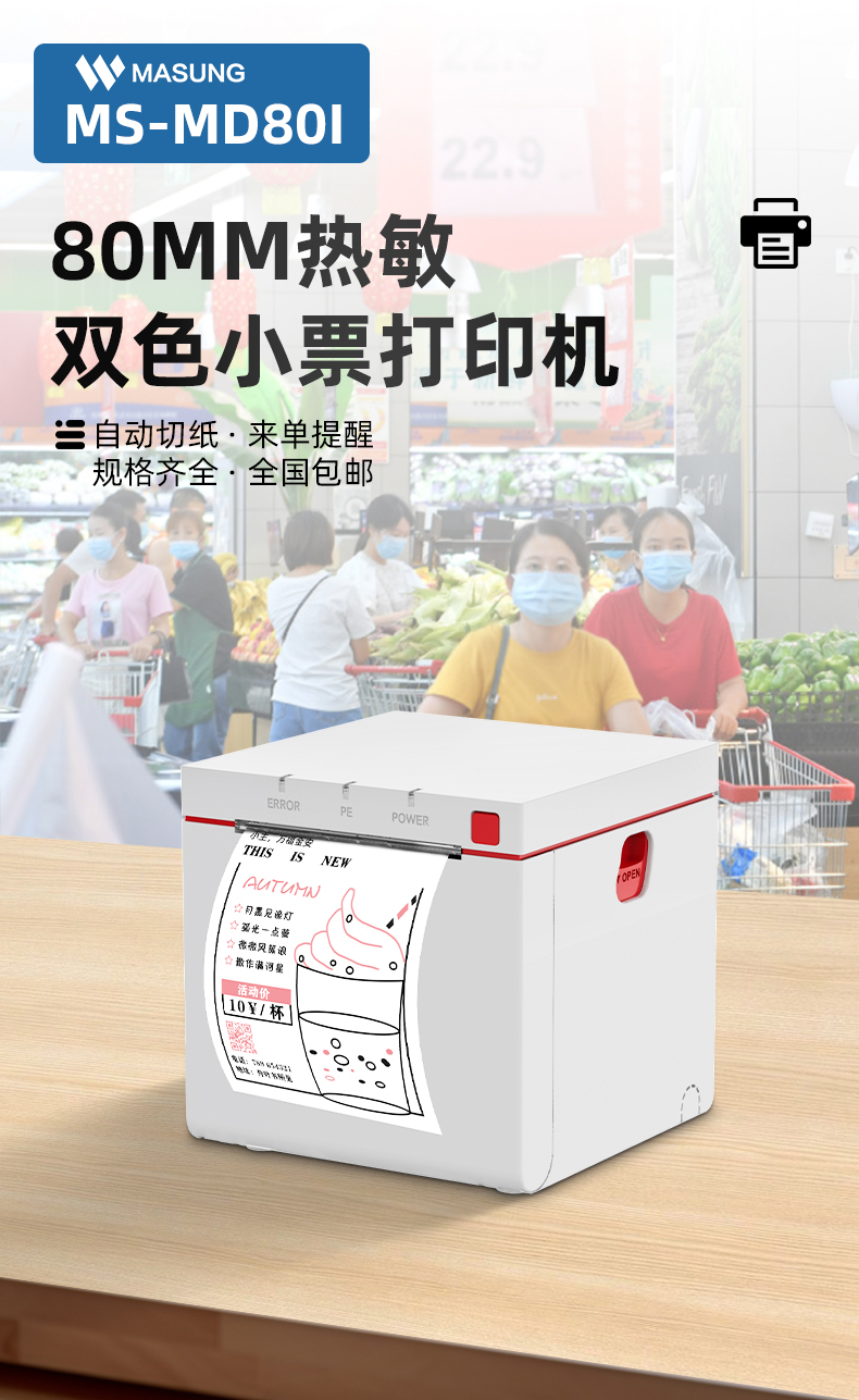 MD80I是一款高顏值的可桌面也可壁掛的雙色熱敏票據打印機。MD80I外形四四方方的,圓潤一體設計、簡于外,精于內。適用于零售商超、中小電商、倉儲物管、影院娛樂等行業領域,更適合新零售、跨境電商、影院行業