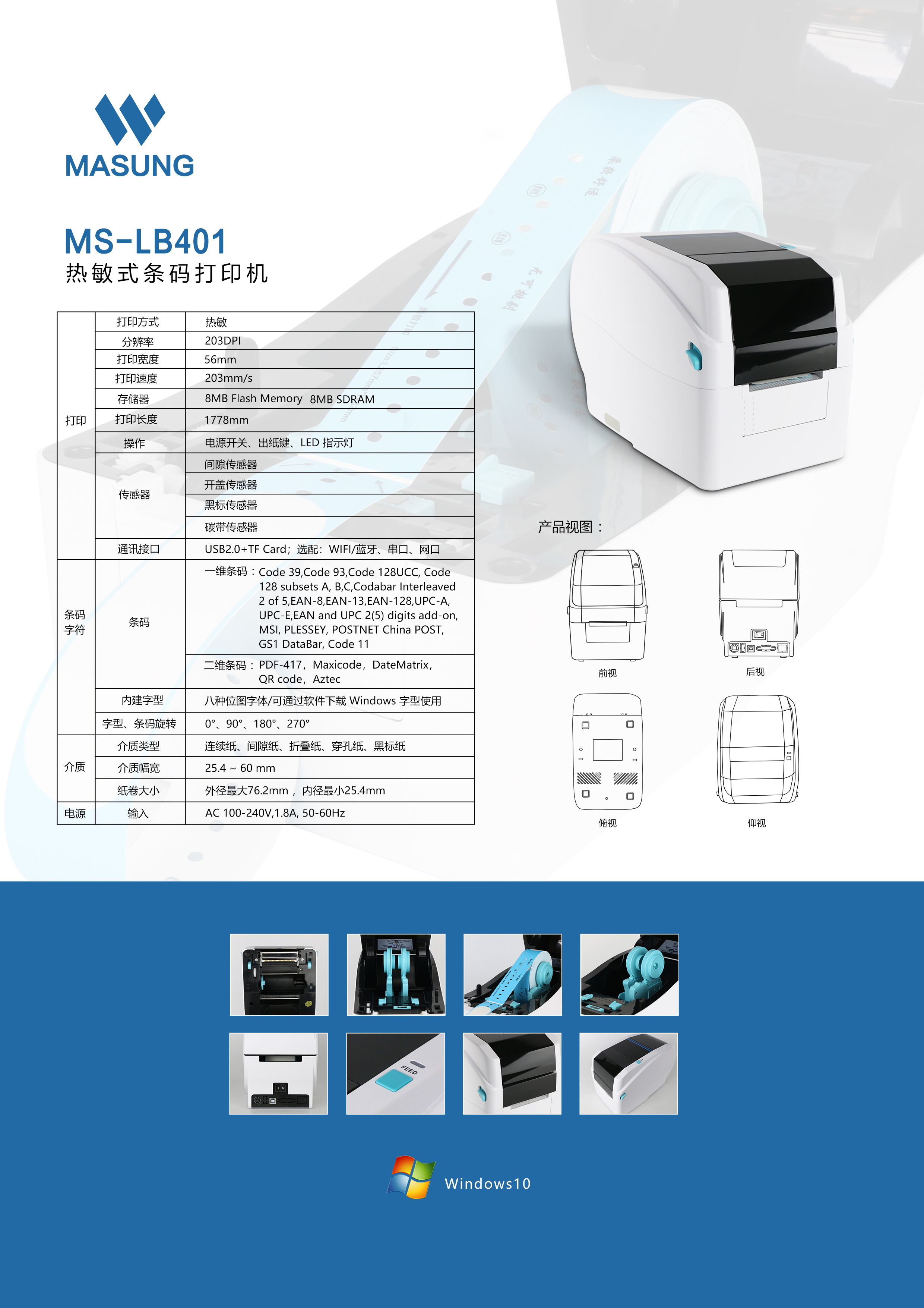 MS-LB401_熱敏熱轉印腕帶打印機,是由美松研發的一款熱敏熱轉印多類型的打印機,主要應用于醫療標簽腕帶的打印使用,它的體積小巧,同時還具有高速度的打印功能。 MS-LB401具有多種接口類型,可通過藍牙,WIFI和網口、串口等多種方式進行連接傳輸,可使用的打印介質有腕帶紙和連續紙、間隙紙和折疊紙、穿孔紙和黑標紙 內部配有限紙和限位器能快速的裝紙進行打印
