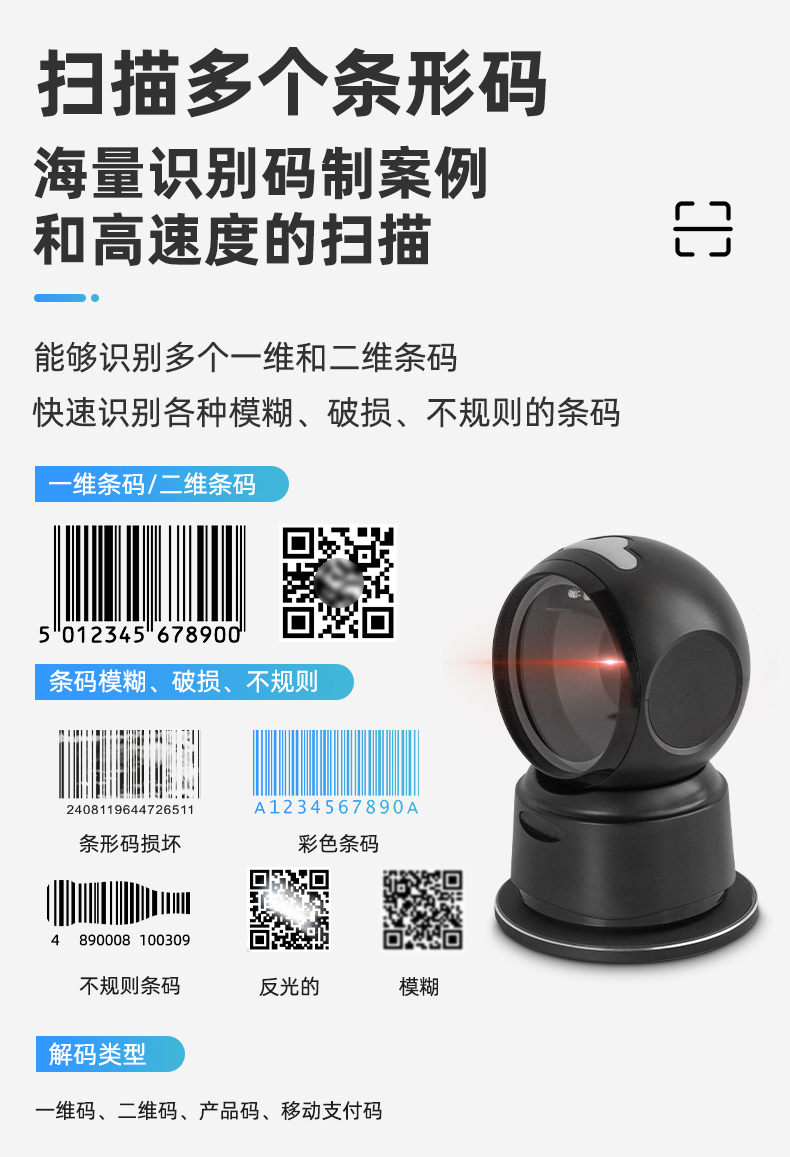 產(chǎn)品特點(diǎn): 全局高速解碼技術(shù) 采用自主研發(fā)的核心技術(shù),極速響應(yīng), 支持快速開(kāi)發(fā)和定制需求 采用二維掃描技術(shù) 兼容一維碼和二維碼的讀取 手機(jī)和紙質(zhì)條碼讀取 采用高速曝光算法,兼容手機(jī)碼和紙質(zhì)碼的 快速讀取 支持多國(guó)鍵盤(pán) 對(duì)不同國(guó)家場(chǎng)景可配置對(duì)應(yīng)輸出鍵盤(pán) 褶皺殘缺碼優(yōu)化 對(duì)褶皺和殘缺條碼進(jìn)行算法優(yōu)化,條碼可識(shí)讀率更高 應(yīng)用場(chǎng)景: 商超、餐飲、收銀等場(chǎng)景。