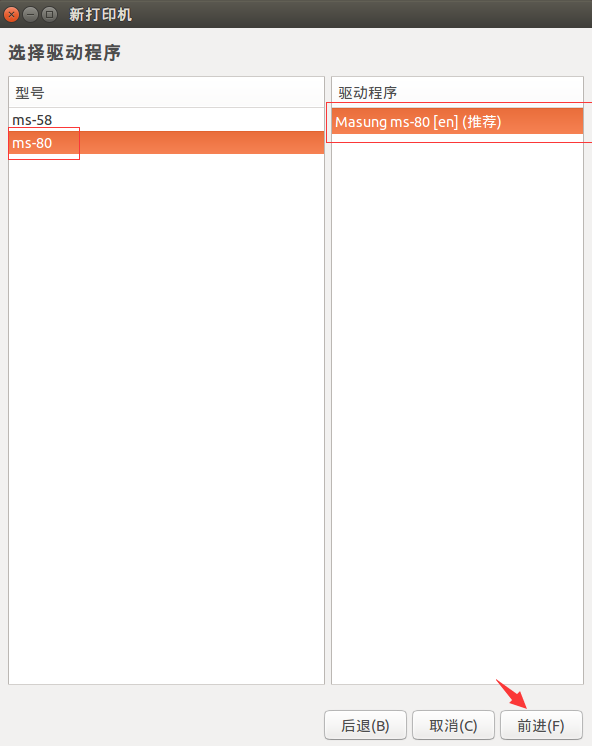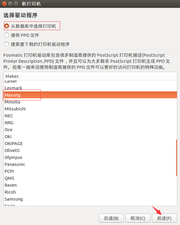 選擇 “從數據庫中選擇打印機”,并選擇 “Masung”,然后點擊前進。