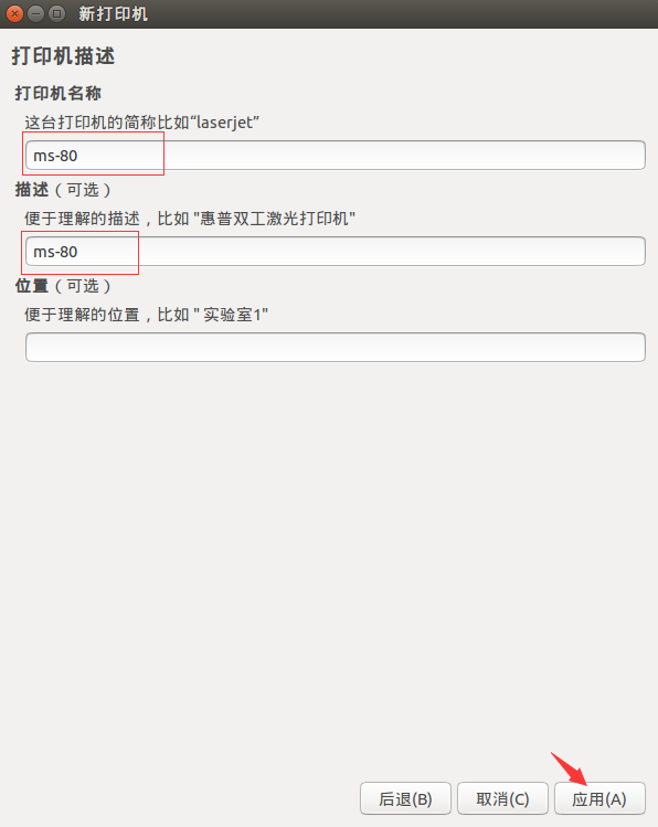 設置打印機名稱(自定義)和打印機描述(自定義),然后點擊應用即可。