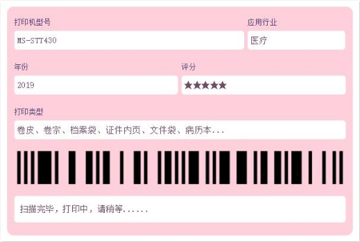美松公司與醫(yī)療器械行業(yè)的合作案例接連不斷,58mm嵌入式打印機(jī)系列之MS-FPT201K被廣泛應(yīng)用于各類醫(yī)療檢測儀器及泌尿系統(tǒng)自助分析檢測機(jī)中;它具有機(jī)身紙倉一體式設(shè)計且具有面板式嵌入安裝特點,更加便捷的被安裝于各類自助終端內(nèi);支持打印統(tǒng)計圖表的功能,在醫(yī)療器械輸出信息中具有更加直觀的顯現(xiàn)。產(chǎn)品MS-LP212系列則具有打印分離不干膠功能,被廣泛應(yīng)用于醫(yī)院化驗科室設(shè)備中,為化驗樣本提供標(biāo)簽打印、快速分離底紙和標(biāo)簽,緩解在科室打印量的壓力。日均人流量過萬的門診部門,病歷打印著實是一個使院方管理頭疼的問題,美松公司針對醫(yī)院病歷打印研發(fā)出一系列創(chuàng)新型整機(jī)產(chǎn)品,專門針對不同打印規(guī)格的病歷本設(shè)計的可調(diào)節(jié)紙倉打印機(jī)MS-STT430系列,采用碳帶熱轉(zhuǎn)印方式針對已印刷的卷皮、卷宗、檔案袋、證件內(nèi)頁、文件袋、病歷本等封面進(jìn)行二次加印的打印設(shè)備。