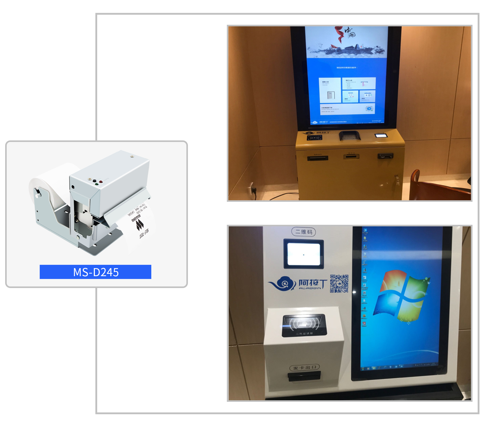 面對各類新型酒店服務的不斷發展,越來越多新型設備被應用在行業之中。美松公司通過展會接觸山東網絡技術有限公司,了解到目前酒店業的主要使用場景及應用要求,成功將 MS-D245 嵌入并批量應用。MS-D245 是由美松公司研發設計的第一代58mm嵌入式打印機,具有高速出票的打印速度,小巧靈活的外觀廣受好評。應用于合作智慧酒店大堂設備中,利用智慧酒店自助服務一條龍:預定,入住,續住,退房均可自助操作。針對各類型的智慧應用設備,美松公司具有豐富的案例經驗,為不同類型的智慧機器提供打印及掃描解決方案,滿足廣大智慧應用市場的發展需求。